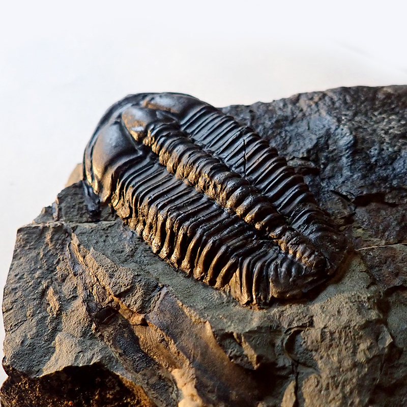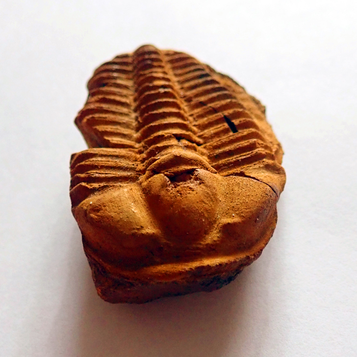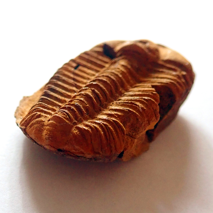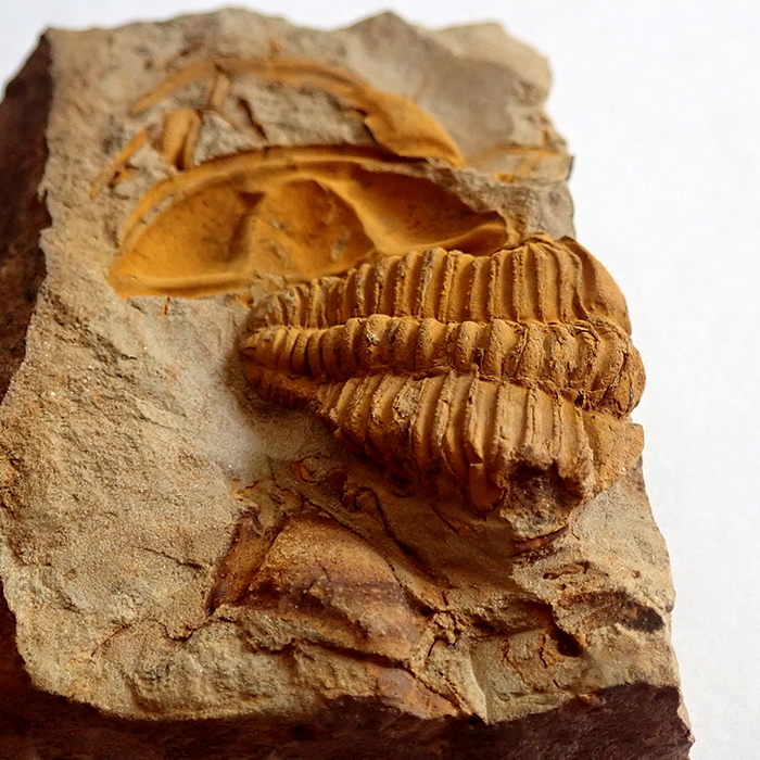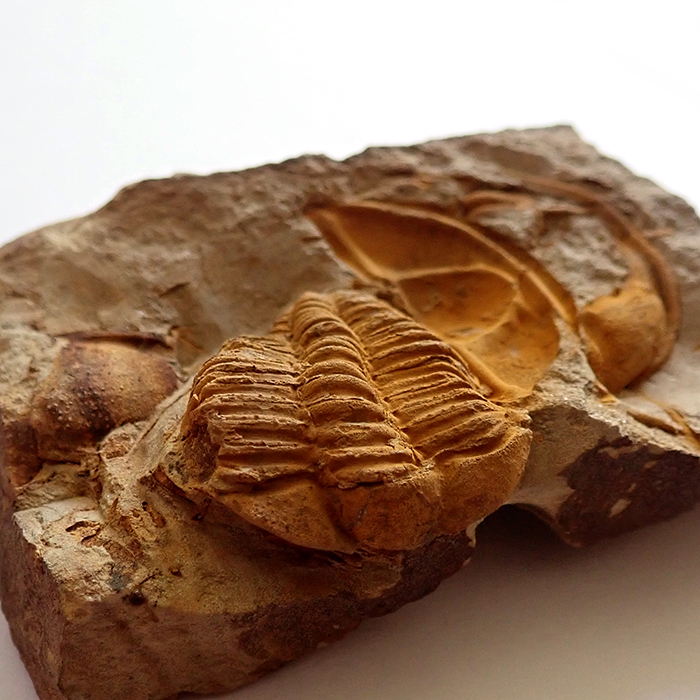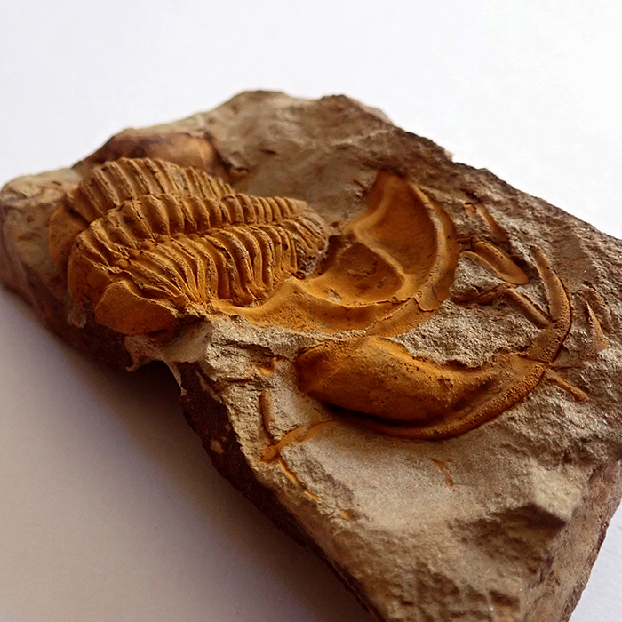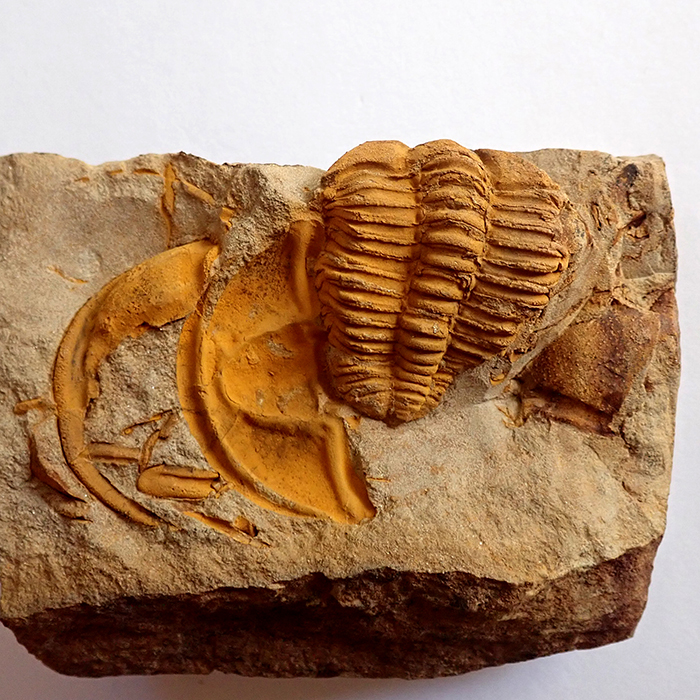 Stočení trilobita (volvace) - v případě ohrožení se trilobit mohl chránit stočením svého těla. U trilobita Conocoryphe sulzeri byla tato vlastnost poprvé prokázána na mnohých nálezech právě z českého kambria. Naprostá většina nálezů stočených trilobitů ale s obranou pozicí nemá nic společného. Ve velké většině jde o postmortální svalovou strnulost (rigor mortis). Určitě jste už mnozí z vás našli mrtvého brouka, který také nesl stopy, či dispozice, po úhynu se stočit do klubíčka. Může jít o stejný princip. Trilobiti i brouci jsou totiž členovci a mechanismus jejich těla funguje přinejmenším od kambrické exploze podobně. Velikost stočeného trilobita (foto pod textem) by v nataženém stavu byla cca 14 mm - Felbabka, 2014.